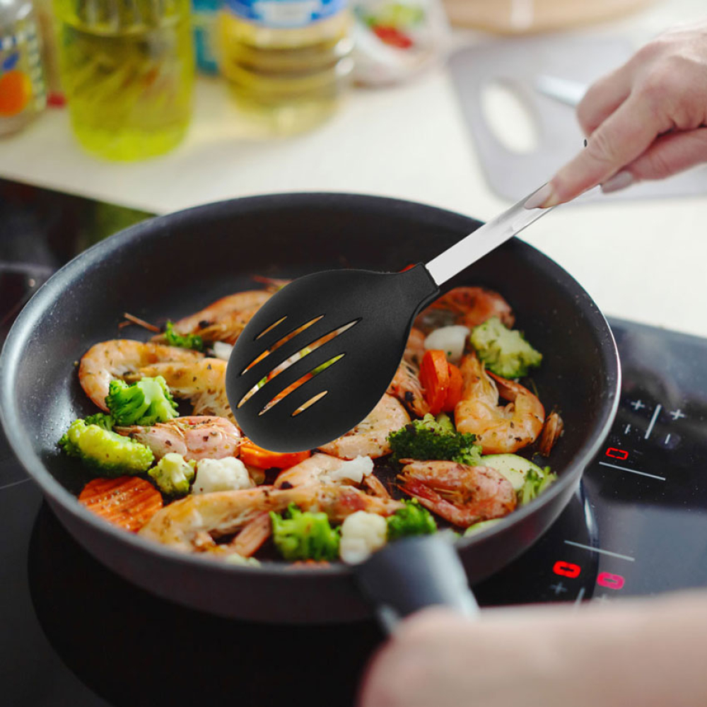 This versatile Slotted Serving Spoon is designed to make cooking and serving more efficient and mess-free. The oval-shaped head with angled slots allows for quick draining of liquids while lifting foods like vegetables, pasta, or fried items.